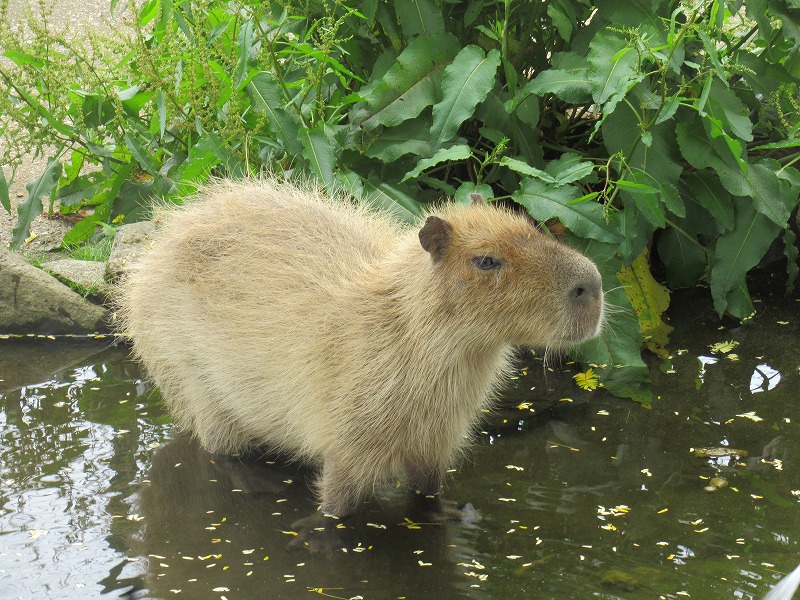 ネズミの仲間の中で一番大きな動物です。南アメリカの湖や川などの水辺に生息していて、泳ぎも得意です。肢(てあし)には水かきがあり、水の中では鼻の穴がピタっと閉じるなど泳ぐのに便利な体のつくりをしています。基本は家族で行動し、他の家族といっしょに100頭もの大集団になることもあります。