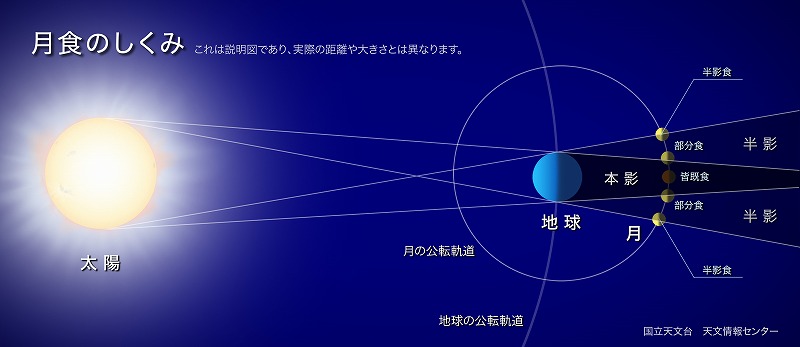 月食は太陽の光によって作られる地球の影(かげ)の中を月が通ることで起こります。今回は太陽の光がほぼさえぎられた地球の影(本影という)の中に、月が完全に入る皆既月食が起こります(図参照)。今回の皆既月食中に見られる月はふだん見ている月の様子と異なります。さて、月はどのように変わるのか調べ、実際の夜空で観察してみてはいかがでしょうか。