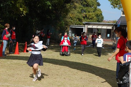 地元企業(きぎょう)や市民グループ、友人・家族ら17チーム、68人が参加。「がんばれ」「ファイト」の声を背に、落ち葉のまう秋晴れのコースを快走した。モンゴル語の補習グループで参加したつくば市立茎崎第三小1年の男子児童は「初めてだったので走る前はドキドキしたけど、走り終わったら風が気持ちよかった」と笑顔で話していた。