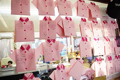 子どもたちがいじめ反対の思いをこめて書いたピンクのシャツの形のメッセージカードも壁(かべ)をかざった。