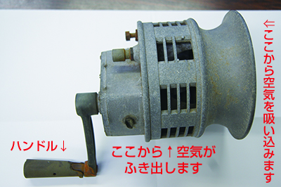 ハンドルを回すと、中の風車が回転し、サイレンの口からすいこまれた空気が横の穴(あな)からふき出します。