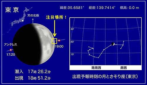 月の光っている方のふち(図の注目場所)からアンタレスが姿を現します。