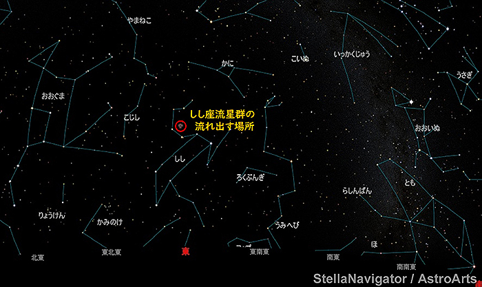 流星群が流れ出す場所は、しし座の頭のあたりですが、流れ星は四方へ流れていくため、できるだけ空全体に目を向けることが観察のポイントです。