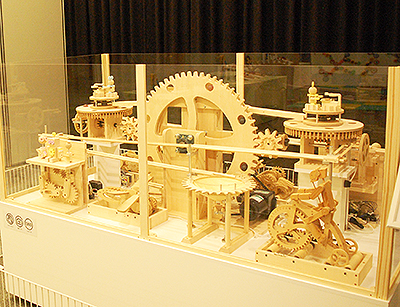 会場には、つまみを回すと歯車同士が回転して力を伝える様子などが見られるカラフルな機構模型や、歯車で動くオートマタ(自動からくり人形)と球が転がるからくり装置を組み合わせた「からくりアート」作品、さまざまな機械や道具に使われている歯車製品など、36点が並ぶ。特に目をひくのが、つくば市在住の美術・木工作家つちやあゆみさんが製作した全長10メートル近い大きな木製歯車のオルゴール。ハンドルを回すと歯車の下についた木の球が木琴(もっきん)に当たり、美しいメロディが奏でられる。