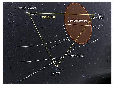 春の星空には、春の大三角が輝いています。その星のひとつ、「真珠星」と呼ばれる青白い星スピカはおとめ座を探す目印の星です。そのおとめ座の上半身には、銀河がたくさん集まる場所があります。この銀河の集団が「おとめ座銀河団」。ブラックホールシャドウの撮影で話題になった巨大な銀河M87も含む大小千個以上の銀河が集まっています。